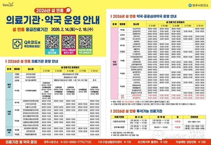 설날 연휴 기간 운영 의료기관 및 약국 정보는 ▲양주시 보건소(☎ 031-8082-7770, 7132) ▲119구급상황관리센터(☎ 119) ▲보건복지부 콜센터(☎ 129)를 통해 문의할 수 있다.