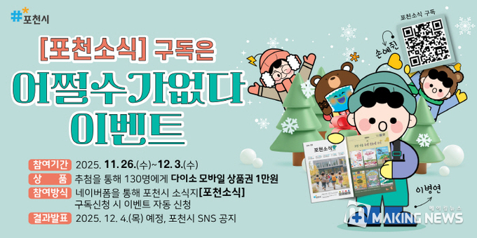 이번 이벤트는 12월 3일까지 진행되며, 시정 소식지 ‘포천소식’을 구독하면 별도의 절차 없이 자동으로 이벤트에 응모된다.